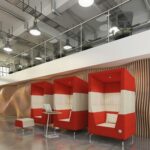 The Alban Top recognises the need for a more relaxed personal space for employees within the modern workplace and its striking design makes it a visual highlight in every office it graces. The stand-alone acoustic booths with canopy and lighting options offer a high level of visual and acoustic privacy where employees can think and work undisturbed, free from surrounding noise.