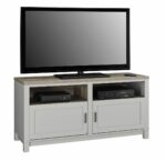 The AmeriwoodHome Carver TV Stand keeps your media devices and accessories organized and your entertainment space free of clutter. With 2 open shelves and 2 cabinet spaces for concealed storage, the TV stand offers plenty of room for your media players, gaming systems, controllers and movies. Made of painted MDF and laminated particleboard, the stand has a sturdy build that supports most flat-panel TVs up to 60?. The TV stand?s matt black finish, distressed woodgrain accents and pewter door handles create an elegant look that will complement a number of different decor styles.