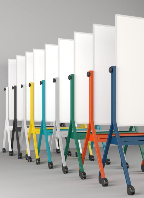 The mobile whiteboard offers a traditional solution for presentation areas, with a modern design to fit contemporary spaces. The leg frame can be finished in a choice of 3 standard metalworks or 6 premium finishes. The board itself can be rotated a full 360° and features a drywipe, magnetic surface.