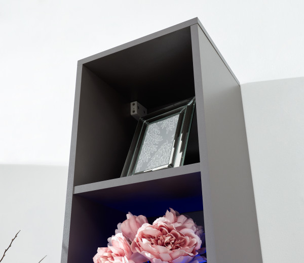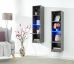 If you have well-thought-out storage, you’ll automatically reduce clutter in your living space. These slender wall-mounted units are a great choice for the smaller home, offering four separate shelf cubbies in a tall form that allows you to store and display your precious items without taking up floorspace. Three open shelves are set above a lower, partially enclosed shelf with lift-up door – all benefiting from a sleek, monochrome finish and high gloss feature front panels. Featuring blue battery-powered LED downlighting for added impact.
