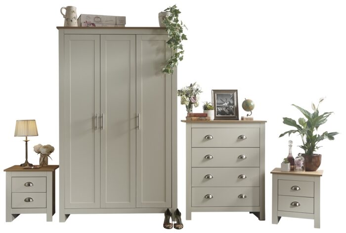 The?Four piece?set consists of a three door wardrobe, four drawer chest and a pair of two drawer bedside cabinets.