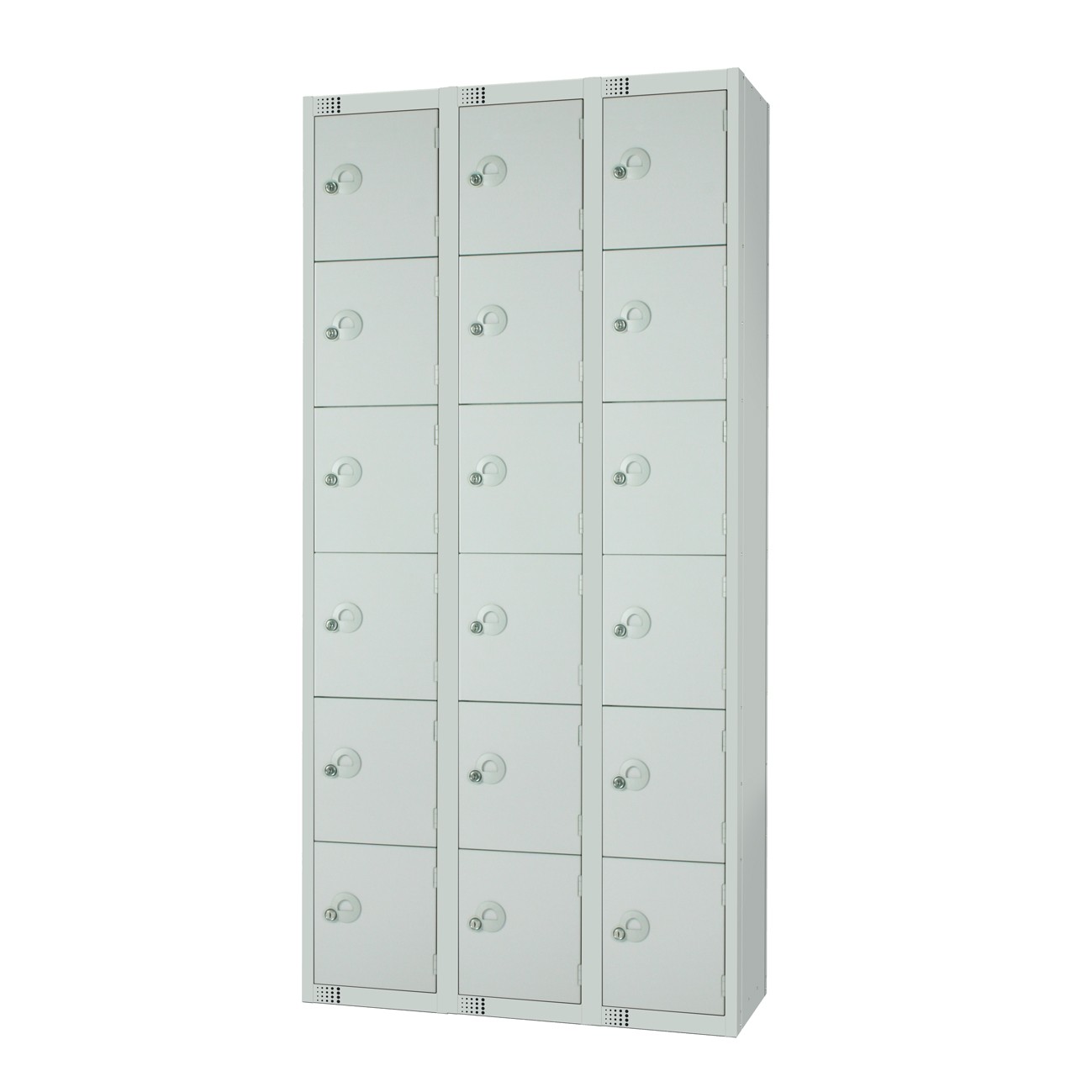 These steel coloured lockers are manufactured to the highest specification. Lockers are welded and riveted in construction. Semi concealed hinges are welded to the door and riveted to the frame, allowing easy replacement of doors. Doors are fixed within a rebated frame to enhance compartment security. Selected doors are reinforced with profiled steel sections. Top and bottom plinths are vented to create an airflow to assist with air changes. The carcass incorporates nesting holes on all sides and a return flange at the base for extra strength and to reduce floor damage. Lockers are manufactured using CR4 and bright galvanised steel components. Material thickness specification 0.9mm doors and frame, 0.7mm carcass and shelves. Painted components are epoxy polyester powder coated prior to assembly to ensure all surfaces are protected. Nested lockers are manufactured with common sides. The materials used classifies this locker as a fire retardant product meeting the BS Class ?0? rating.