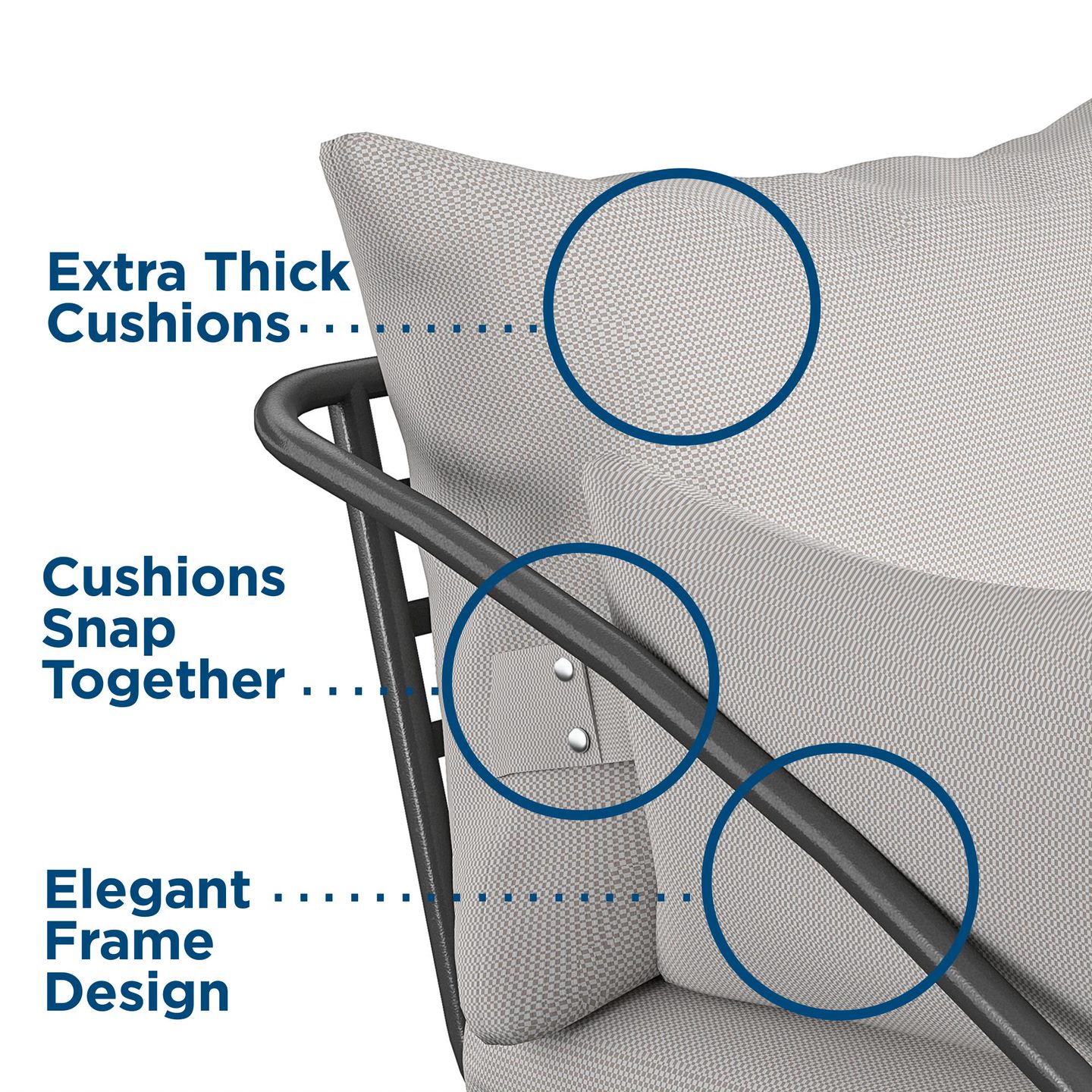 •Built from durable, weather-resistant steel and painted in a charcoal powder coating. Matching warm gray cushions that conveniently snap together.